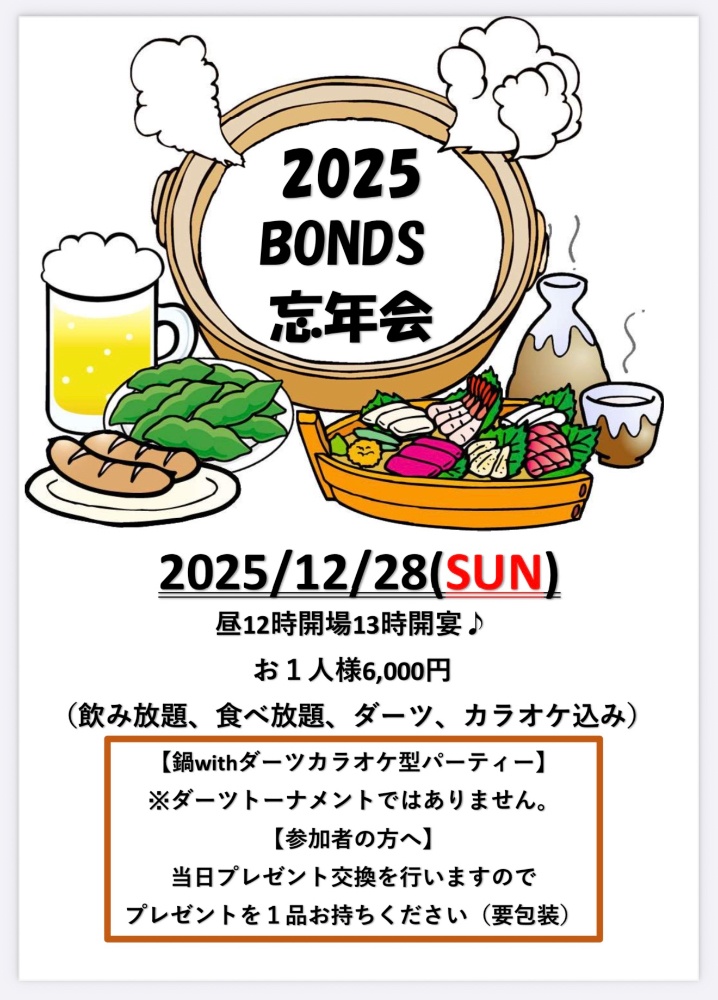 12月28日(日)12時開場13時開宴🎵2025BONDS忘年会開催🥳参加者大募集中‼️